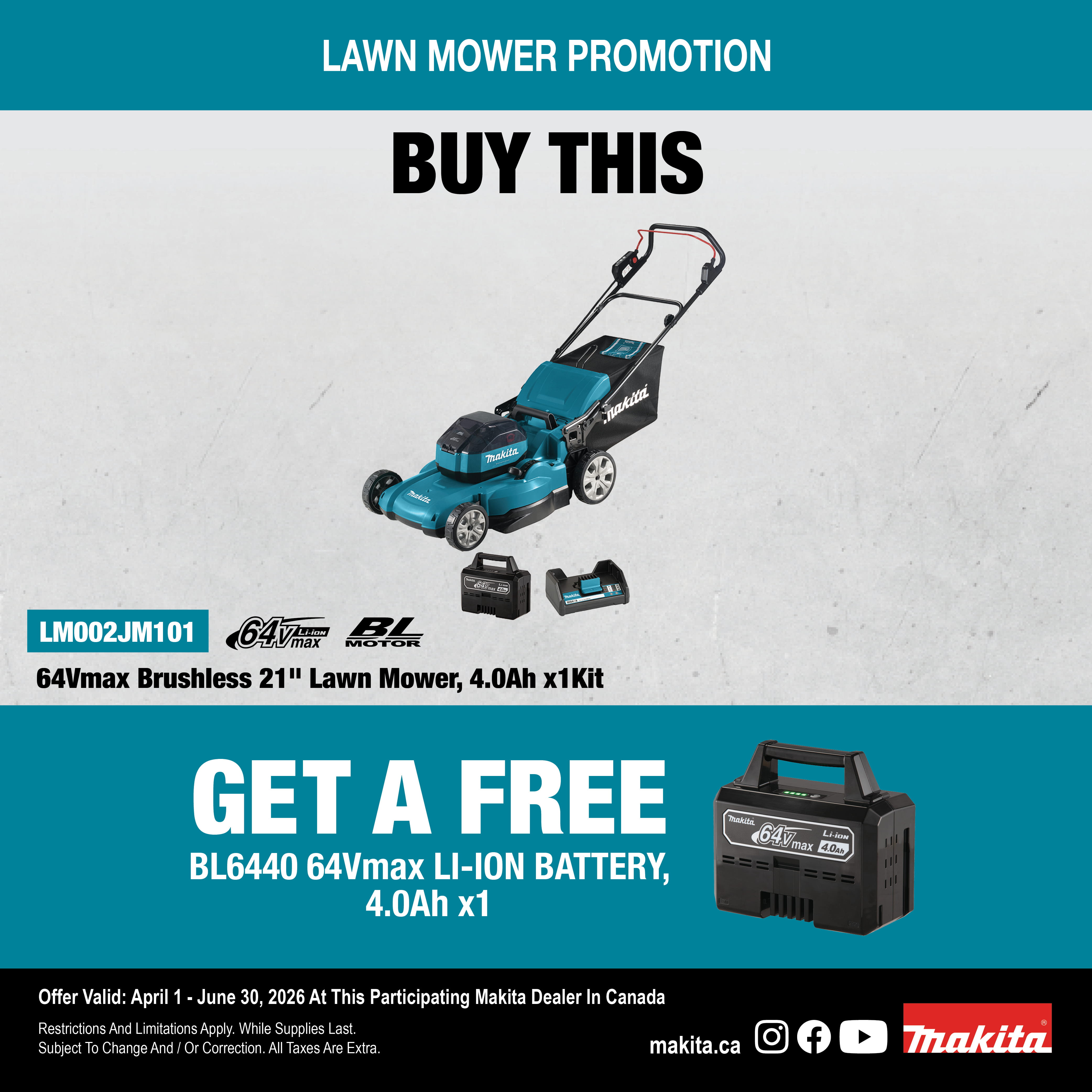 Items Included: 64Vmax (4.0Ah) Li-Ion Battery BL6440 (BL6440), Charger (DC64WA), Battery Cover (413A28-9), Blade Set (191V96-5), Rod 6 (327589-6), Mulching Plug (413945-7), Socket Wrench 17 (782210-8)