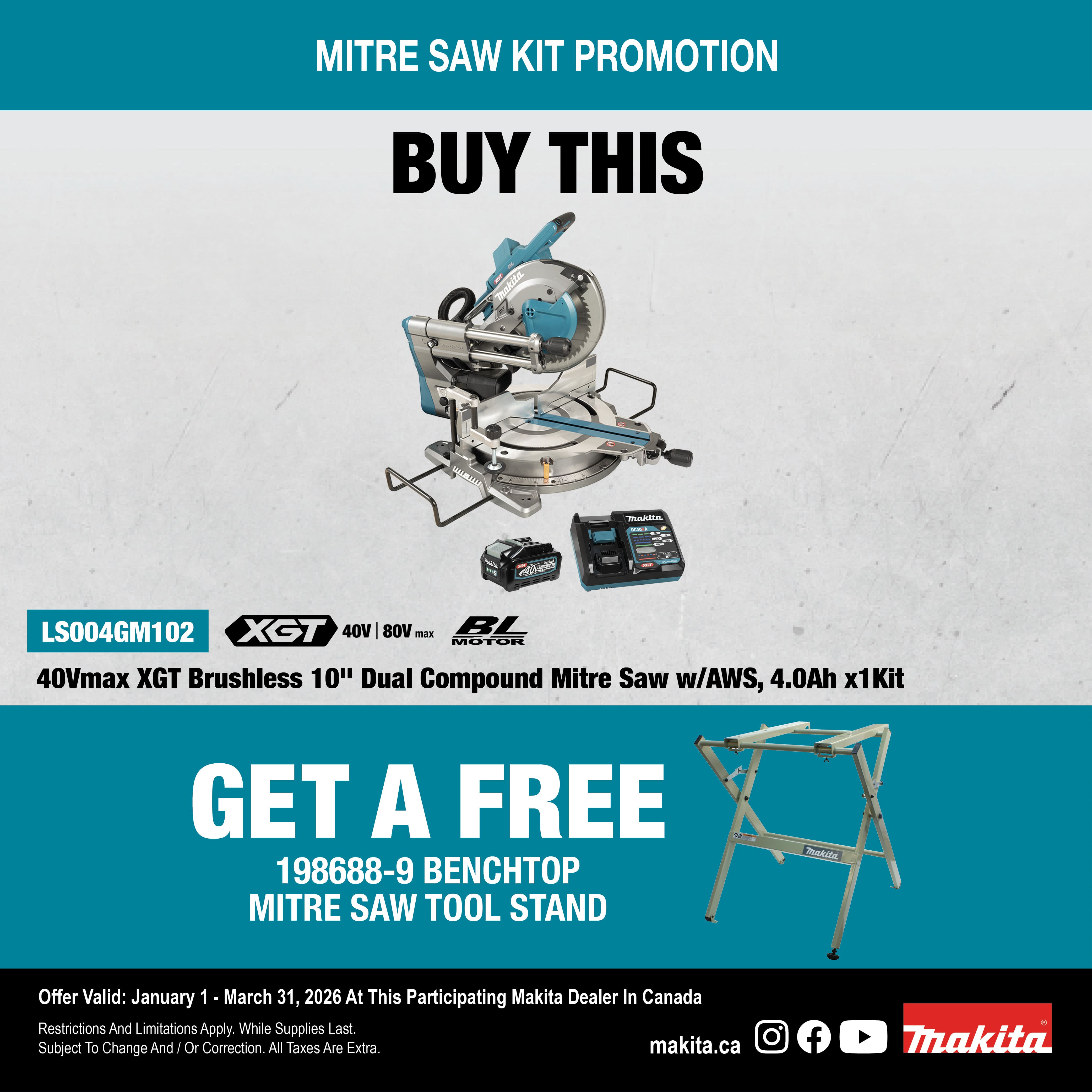 Items Included: 40Vmax XGT (4.0Ah) Li-Ion Battery BL4040 (BL4040), Rapid Charger (DC40RA), 10" C.T. Blade 45T (B-62103), Dust Bag (122852-0), Vertical Vise (126617-2), Triangle Rule (762001-3), Holder 200 (327095-1), Hex Wrench 6 (781044-6)