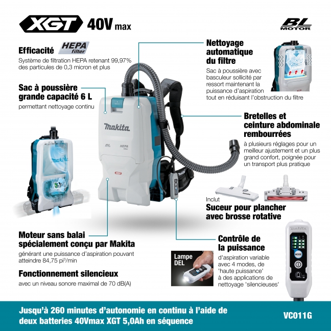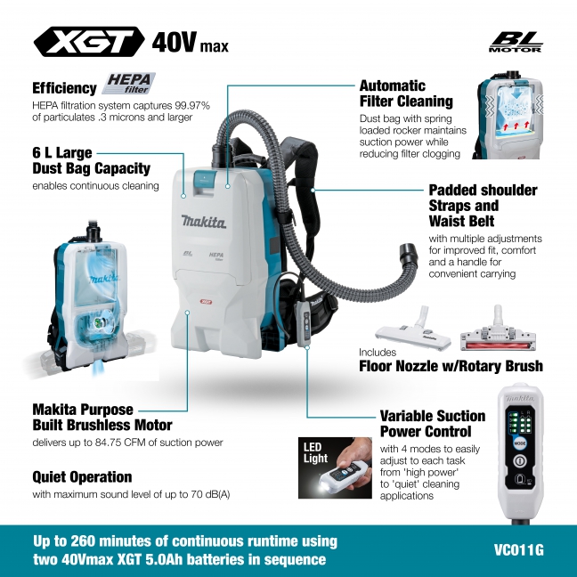 Items Included:Batteries and Charger Sold Separately. HEPA Filter (191D12-9), 1-1/4" X 3' Hose (199453-9), Hose Band (166116-2), Floor Nozzle (191G86-8), Corner Nozzle (198919-6), Telescopic Pipe (140G19-0), Bent Pipe (140G26-3), Paper Filter Bag (191C26-2), Dust Bag (191C30-1), Backpack Shoulder Harness (162C94-2)